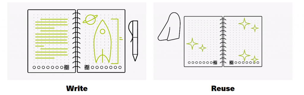 Rocketbook se promociona como un cuaderno infinito compuesto por hojas de poliéster con un aspecto parecido a las hojas tradicionales.